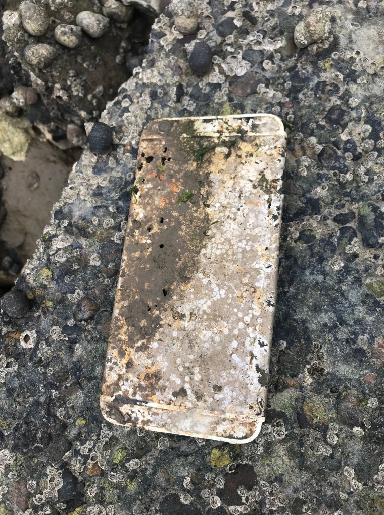 We arrived at the river for around 5.30pm, and we were fishing within minutes. That’s the beauty of lure fishing, you just attach a reel to the rod, a lure to the line and cast out. High tide wasn’t until 22:20 so initially, there weren’t many places to fish. We started by fishing just by the steps as you can walk right up to the low water there. Elsewhere along the river with a few exceptions, its mostly thick horrible mud that sucks the shoes from you’re feet if you step in it. I was looking where I was stepping due to the uneven rocks and out of the corner of my eye saw a flash of gold. I went for a closer look and it turned out to be an iPhone, it had obviously been there a while as the battery had expanded and the screen popped off, but it was still pretty cool to find a phone that some poor soul had probably dropped in the water.