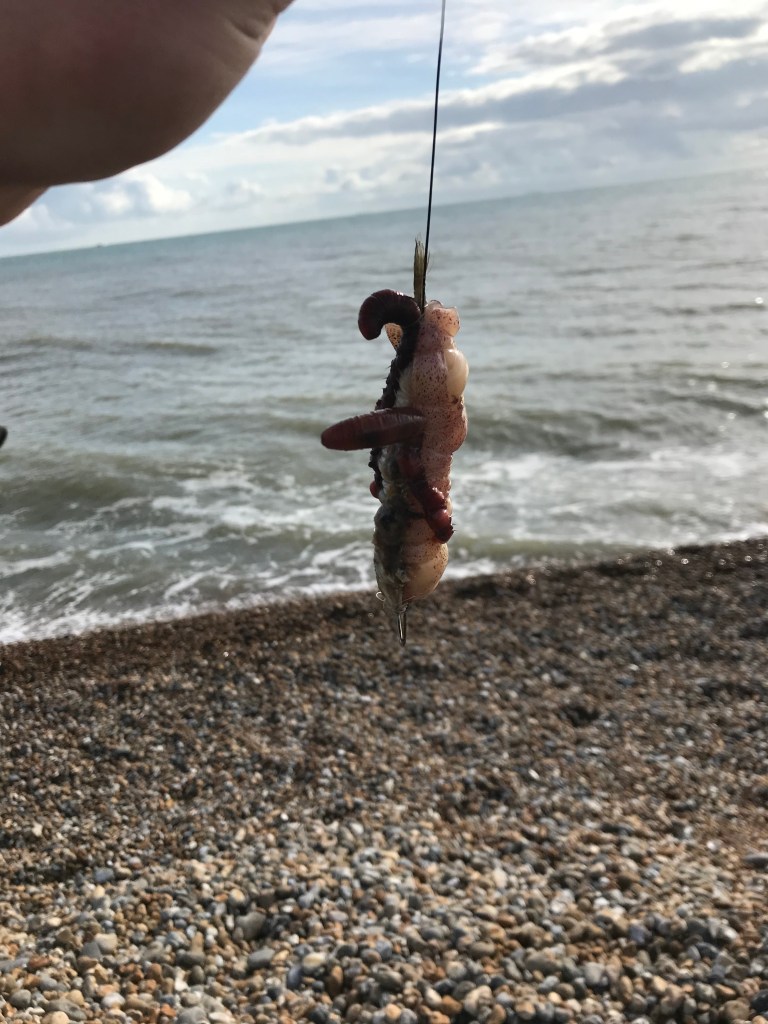 The beach was made up of stones and was much steeper than the beaches we had previously fished. We eagerly set up the rods, anticipating that it would be a fantastic days fishing ahead of us. We both used thee hook flapper rigs on one rod and pulley rigs with bigger baits on the other. The hope was to keep busy with whiting or the odd bass while waiting for one of our bigger baits to be picked up by an early cod, bass, smoothound or skate. We were using the Gemini bait loader tool to wrap up squid, sprat and worm baits. They looked great and we knew if the bigger fish were here then they would definitely take this bait. Both of our first casts proved fishless, however, we weren’t disheartened. We still had the whole day ahead of us.